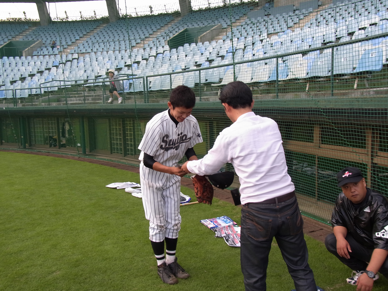 来月下旬にアメリカ遠征に行く県選抜メンバーが発表されました。その中に佐藤君(2年投手)萩谷君(1年外野手)が選ばれました。活躍を期待しています。また、本日の茨城新聞のスポーツ欄に東日本軟式野球選手権の記事が掲載され、 OBの井坂君(筑波銀行)の活躍ぶりと写真が掲載されています。茨城新聞を見る機会があればチェックしてみて下さい。